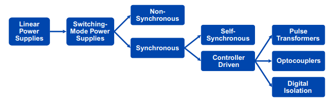 虽然所有类型仍然可用,但开关模式电源已从非同步降压变换器转移同步整流。同步整流已从自同步发展到控制器驱动。大多数开关电源设计都是内部隔离的。同步栅极驱动隔离是最具挑战性的隔离元件在现代开关电源中,已从脉冲变压器迁移到光耦合器,再到数字隔离器,如隔离器自旋电子隔离器。