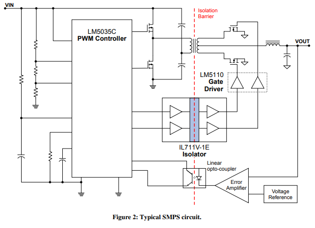 图2中的典型开关电源电路显示了通常必须穿过开关电源隔离栅的三个信号:变压器将脉宽调制控制器与输出电压隔离;输出误差放大器提供隔离反馈;和两个隔离通道来驱动同步门驱动器。